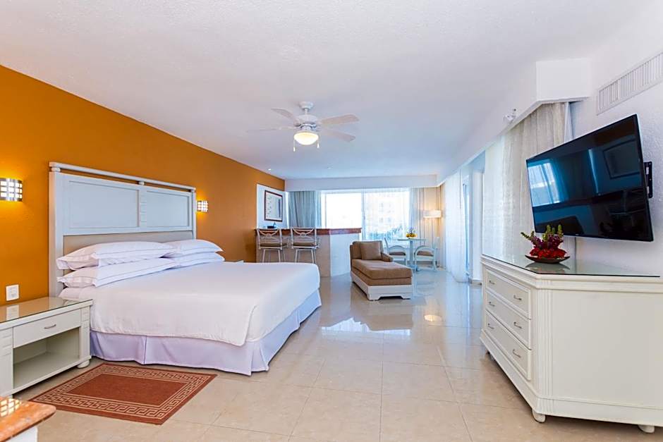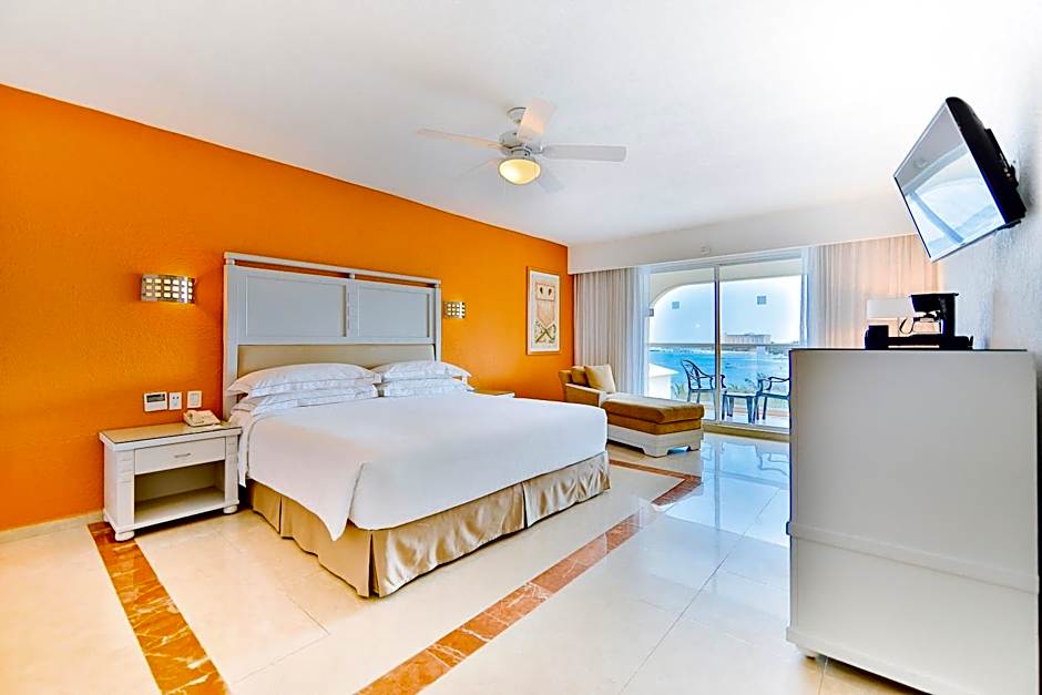 This room is features Mediterranean-style and views of the Caribbean Sea. Amenities such as side table, coffee maker and ceiling fan are also included.
